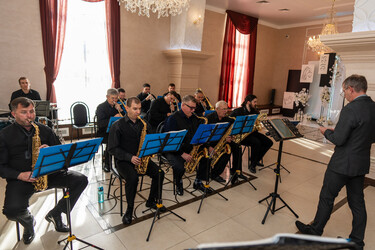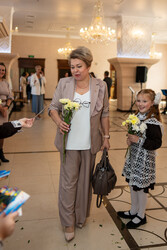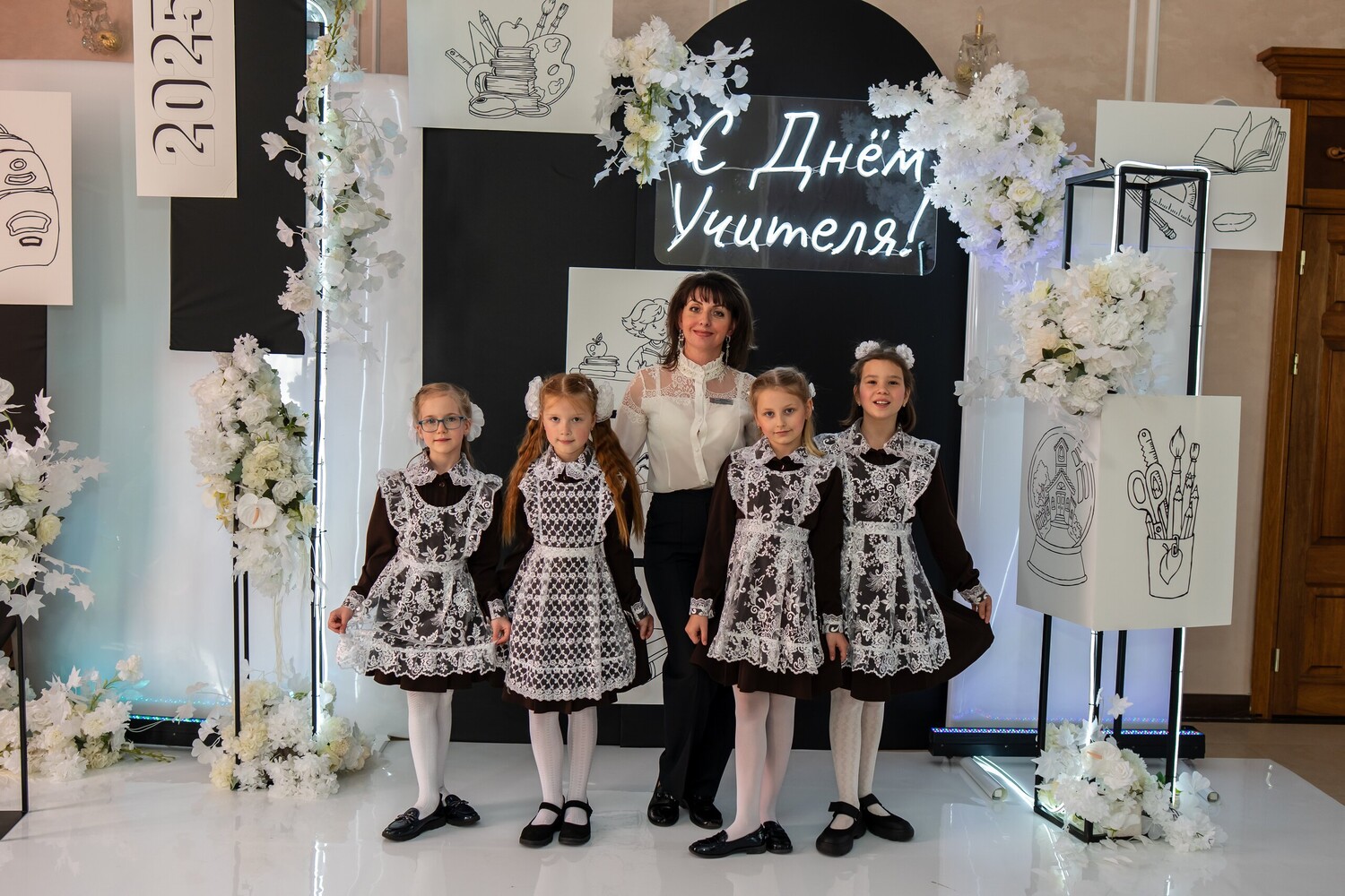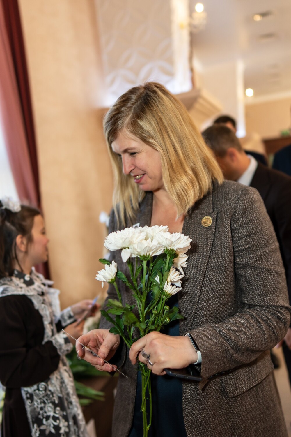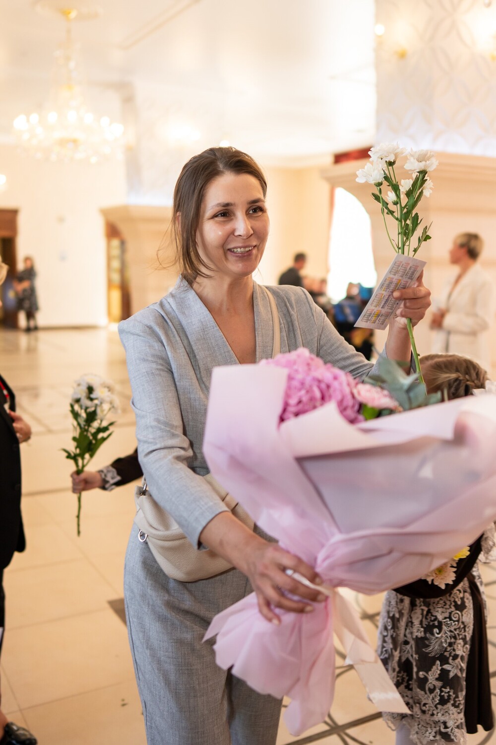 Хороший настрой на праздник обеспечили своим исполнением Городской оркестр и школьницы, встречающие гостей цветами и подарками у дверей зала. А также стильная фотозона, где все гости активно фотографировались.